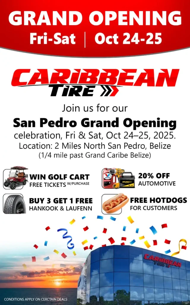 Caribbean Tire is thrilled to announce the Grand Opening of our newest location in San Pedro, Belize, happening this Friday and Saturday, October 24–25, 2025! Get ready for two days of exciting giveaways, unbeatable deals, and fun for the whole family.